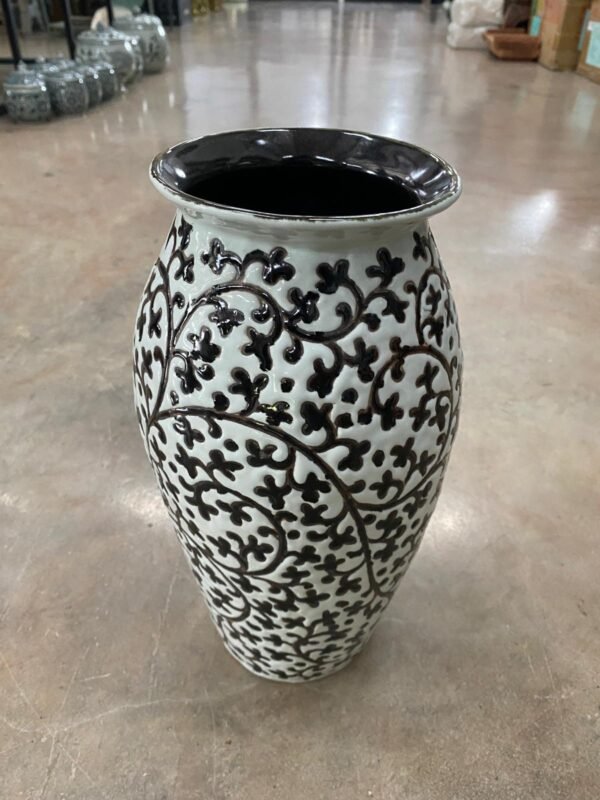 Elegant handpainted vase features traditional Lanna floral vine designs in a striking black on a white antique background, offering a classic and sophisticated look. The intricate patterns wind gracefully around the vase, showcasing the skilled craftsmanship of northern Thai artisans. With a diameter of approximately 18 cm and a height of 30 cm, this vase is perfect for making a bold statement in any room. Its graceful, rounded shape and flared rim make it ideal for holding larger floral arrangements or serving as a standalone decorative piece. The glossy finish enhances the rich contrast of the design, adding a timeless appeal to your home décor.