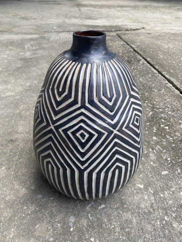 Distinctive Hill Tribe pot features bold geometric patterns carved into its dark, textured surface, reflecting the traditional craftsmanship of northern Thailand’s hill tribes. The intricate designs are not only visually striking but also evoke a sense of cultural heritage and artisanal mastery. Measuring approximately 25.5 cm in diameter and 33 cm in height, this pot is perfect for use as a decorative centerpiece or a unique accent piece in your home. Its earthy tones and robust form make it ideal for adding a touch of tribal elegance to any space. This pot seamlessly blends ancient artistry with a modern aesthetic, making it a timeless addition to your décor collection.